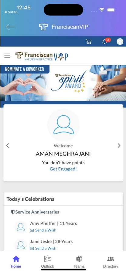 The FranciscanVIP page shows your personal welcome with your name and current point balance. There is a “Nominate a Coworker” button at the top where you can submit recognition for someone who has gone above and beyond. You will also see the Franciscan Spirit Award banner and a Today’s Celebrations section that lists Service Anniversaries. You can tap “Send a Wish” next to any coworker’s name to congratulate them on their milestone.