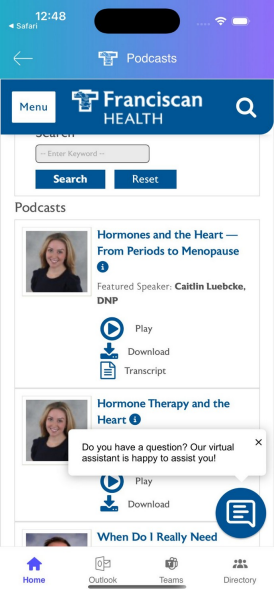 The Podcasts section takes you to the official Franciscan Health podcast page. These short podcasts feature doctors and staff discussing a variety of health topics relevant to both employees and the community.