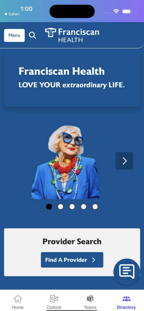 The Directory tab in the bottom navigation bar is different from the People Directory in the All Apps menu. This tab opens the public Franciscan Health website where you can use the Provider Search tool to find healthcare providers, browse services, and access other community-facing resources.