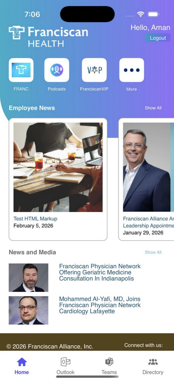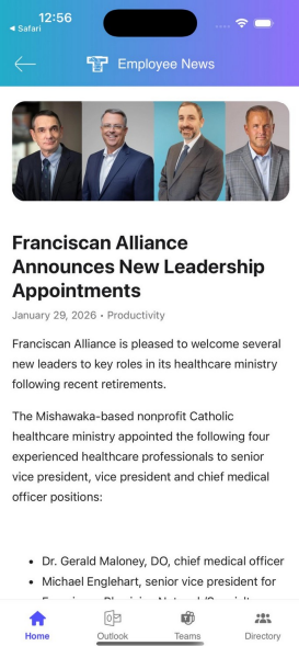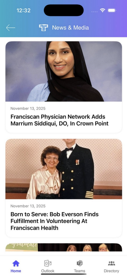 The News & Media section gives you a dedicated view of all the public-facing news articles and media coverage related to Franciscan Health. This is separate from the Employee News section on the Home Screen.