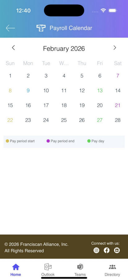 The Payroll Calendar gives you a clean, easy to read calendar view of your pay schedule. It highlights important dates with color coding so you can quickly see when each pay period starts, when it ends, and when your pay day is.