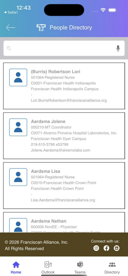 The People Directory gives you a searchable directory of Franciscan Health employees. You can look up any coworker by name and find their job title, department, campus location, phone number, and email address.