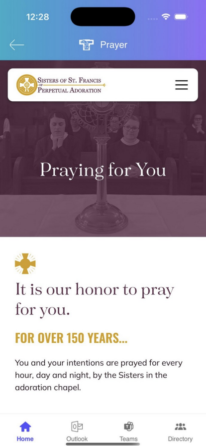 The Prayer tile takes you to the Sisters of St. Francis of Perpetual Adoration prayer page, where you can submit prayer requests and intentions.
