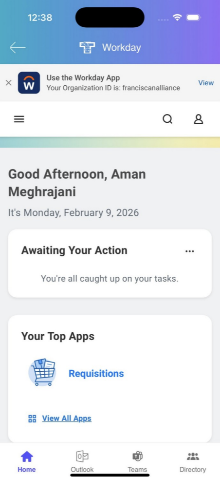 After signing into the app itself, you are good to browse the Home Screen, read news, check the Payroll Calendar, and use other built-in features. Some tiles like Workday, FRANC, and FranciscanVIP require a one-time Microsoft authentication when you open one of them for the first time. Once you complete that sign-in on any one of those tiles, your session carries over to all the others automatically. So in total, you will only need to sign in twice: once into the app, and once into any tile that requires Microsoft authentication. After that, everything just works.